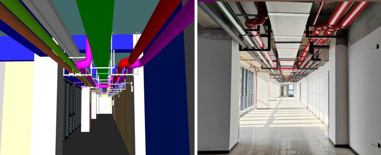 自项目启动之初,泰宏建设便确立“智能建造与数字化生产”核心导向,引入“BIM+数字孪生智慧工地平台”,将BIM技术深度融入机电工程全建设流程,实现从设计优化、施工管控到运维预判的全链条数字化赋能。依托BIM技术的三维可视化、参数化建模及模拟仿真优势,项目重点开展三大核心实践:一是深化管线综合设计与优化,通过碰撞检查精准排查管线冲突问题,结合净高分析优化排布方案,同步科学规划施工场地布局,有效压缩临时用地规模,减少资源浪费;二是强化施工安全管控,借助基坑工程模拟技术对施工流程进行预演,提前识别潜在风险点,辅助制定科学施工决策,显著降低安全隐患;三是提升施工效率与质量,结合智慧建造技术实现施工工序的精准衔接与可视化交底,为“一次成优”的工程质量目标提供坚实保障,切实规避后期拆改成本。
