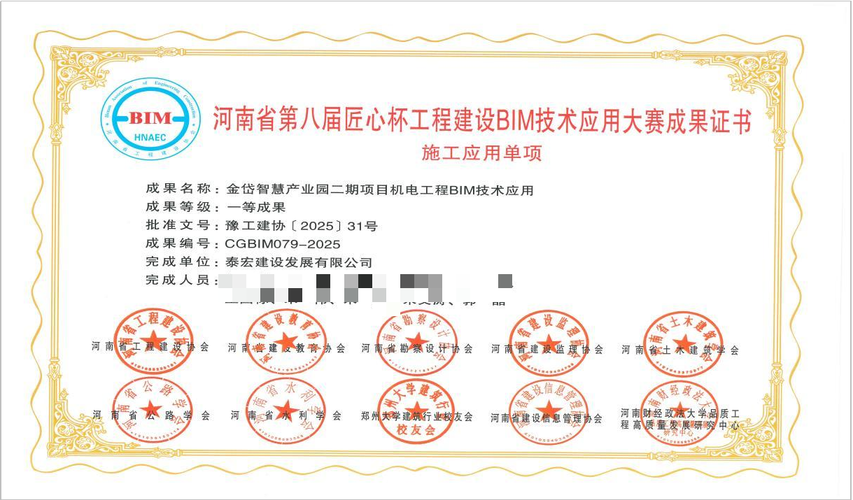 2026年1月10日,河南省第八届“匠心杯”工程建设BIM技术应用成果交流会在南阳师范学院隆重举行。会议由河南省工程建设协会、河南省建设教育协会、河南省勘察设计协会、河南省建设监理协会、河南省土木建筑学会等十家单位联合主办。星空官方网页版申报的“金岱智慧产业园二期项目机电工程BIM技术应用”成果,凭借突出的技术创新性、扎实的实践成效及显著的示范价值,在众多参赛作品中脱颖而出,荣获施工应用单项组一等成果奖,彰显了泰宏建设在数字化建造领域的过硬实力。