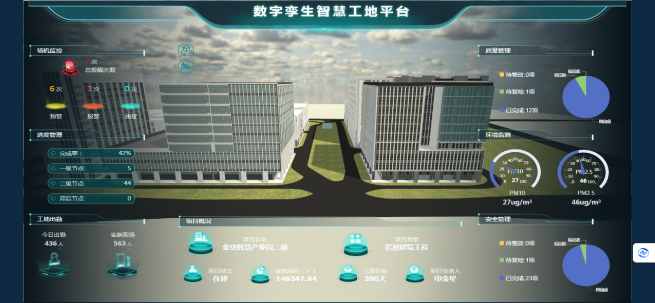 在数字孪生智慧工地平台的支撑下,项目构建了一体化管控体系,集成安全、进度、质量、成本、设备监测等关键管理模块,实现工程建设全过程的全方位、可视化、精细化管控。通过该平台,项目实时捕捉施工动态数据,精准识别并预警安全风险,高效把控工期节点,同时优化资源配置与成本核算,真正实现降本增效与品质提升的双重目标,为同类小微企业园区建设提供了可复制、可推广的数字化建造方案。