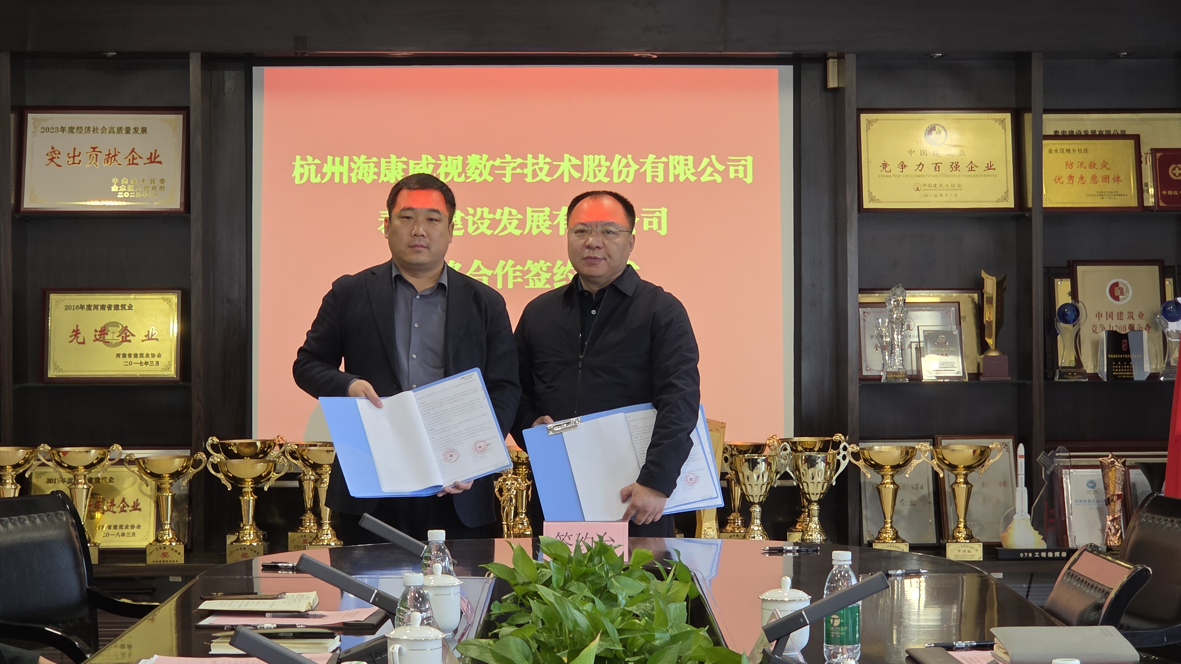 泰宏建设总经理郭强与海康威视河南业务中心总裁齐立强分别代表双方签署战略合作协议。